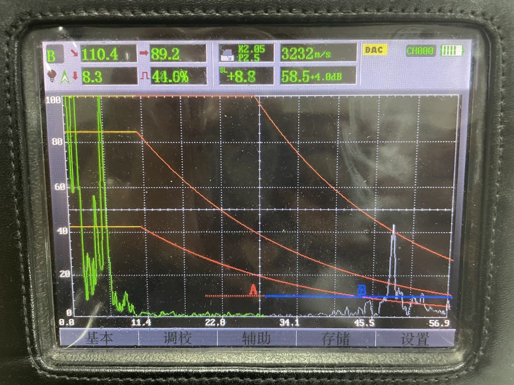 探頭置于B處:顯示深度略大于2倍板厚(如儀器設置了根據工件厚度自動計算缺陷深度功能,則顯示深度接近余高高度,但已超出2次波范圍)。